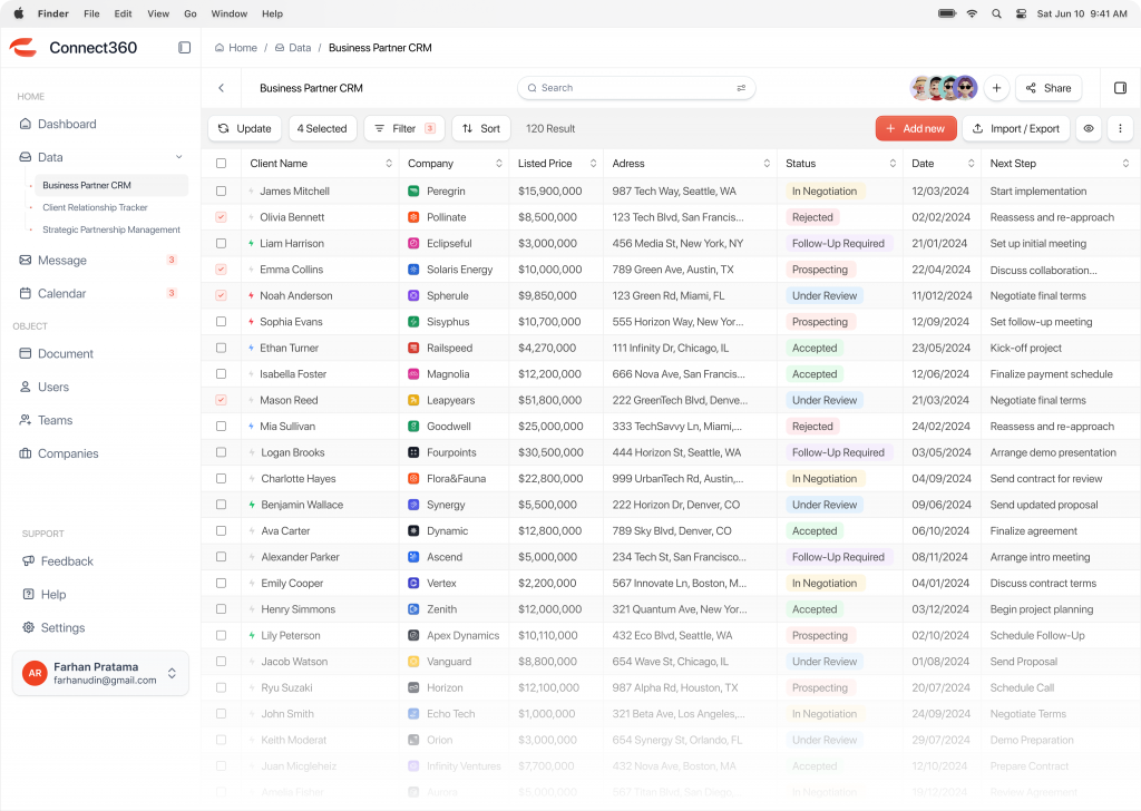 The Connect360 CRM Business Partner Dashboard is an essential tool for businesses looking to manage and optimize their partner relationships. With its robust features for collaboration, performance tracking, and secure data management, Connect360 helps businesses build stronger, more productive partnerships.