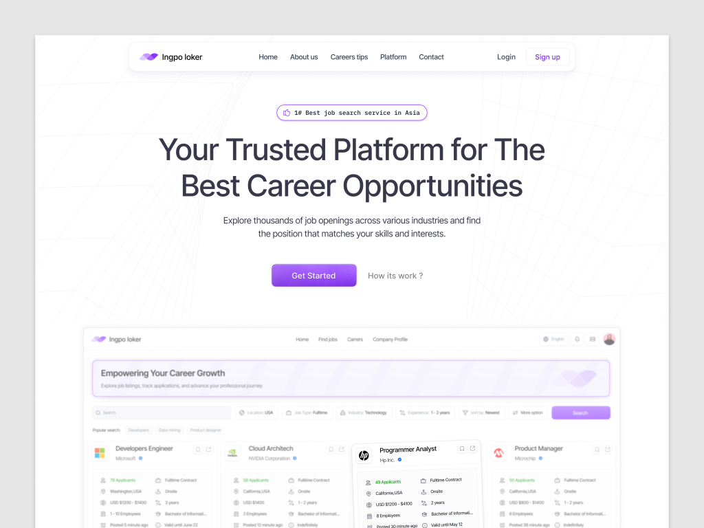 The Job Finder Landing Page for Ingpo Loker is designed to attract job seekers and provide a seamless experience in discovering and applying for job opportunities. This page serves as the first point of contact, presenting essential information and features in an engaging and user-friendly manner.
