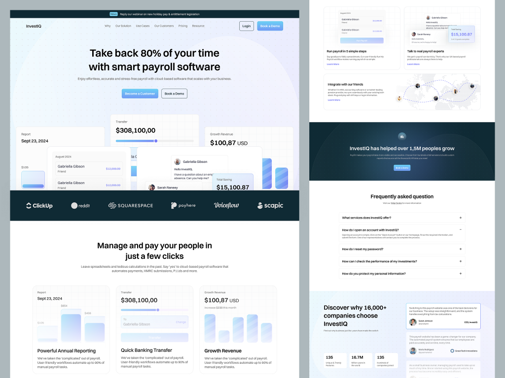 The Payroll Finance Landing Page for InvestIQ is designed to captivate businesses seeking a reliable, efficient, and comprehensive payroll solution. This landing page highlights key features, benefits, and the overall value proposition of the InvestIQ payroll finance software, tailored to meet the needs of both small businesses and large enterprises.