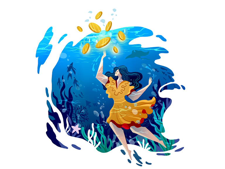 Dive into the exhilarating world of cryptocurrency with a captivating illustration that brings together the elements of adventure, finance, and the vastness of the digital ocean. Picture this: A woman fearlessly navigating the waves, chasing after a shimmering crypto coin that dances just above the ocean’s surface. Let’s explore the key elements of this dynamic illustration.