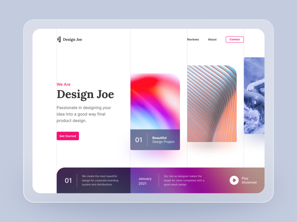Upon entering Design Joe’s landing page, visitors are greeted with an artistic masterpiece that’s bound to leave a lasting impression. The design employs a harmonious blend of bold and subtle colors, captivating typography, and engaging visuals that immediately convey the agency’s creative prowess.